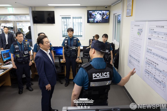 [서울=뉴스핌] 이재명 대통령이 3일 서울 중구 중부경찰서 약수지구대를 찾아 추석 연휴 기간 치안 활동 등을 보고 받고 있다. [사진=대통령실] 2025.10.03 photo@newspim.com