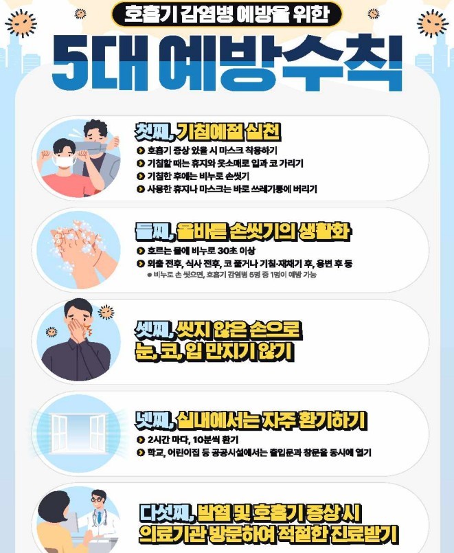 5일 질병관리청에 따르면, 감염병 확산을 예방하기 위해 개인위생 수칙을 준수하고 의심 증상이 있는 경우 가까운 보건소나 감염병콜센터(1339)로 즉시 신고해야 한다.