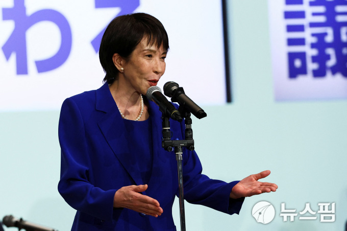 4일 치러진 일본 자민당 총재 선거에서 승리한 다카이치 사나에 전 경제안보상이 승리 연설을 하고 있다. [사진=로이터 뉴스핌]