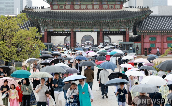[서울=뉴스핌] 김학선 기자 = 추석 황금연휴를 맞아 서울의 주요 궁궐과 종묘, 조선왕릉 등이 무료 개방한 가운데 5일 서울 경복궁이 우산을 쓴 관람객들로 붐비고 있다. 2025.10.05 yooksa@newspim.com