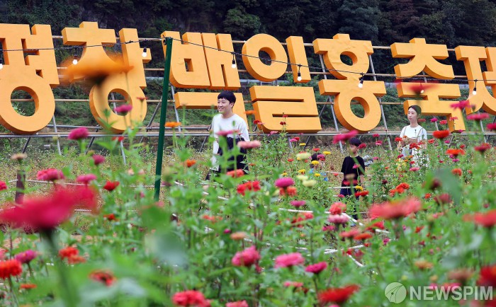 [서울=뉴스핌] 양윤모 기자 = 5일 오후 추석연휴를 맞아 평창읍 평창강 일원에서 열린 '2025 평창 백일홍축제'를 찾은 방문객들이 백일홍 꽃밭에서 연휴를 즐기고 있다. '가을향기, 백일홍으로 물들다'를 주제로 열리는 올 해 축제는 백일홍, 코스모스 등 다양한 볼거리 및 체험 프로그램으로 12일까지 펼쳐진다. [사진= 평창군청] 2025.10.05 yym58@newspim.com