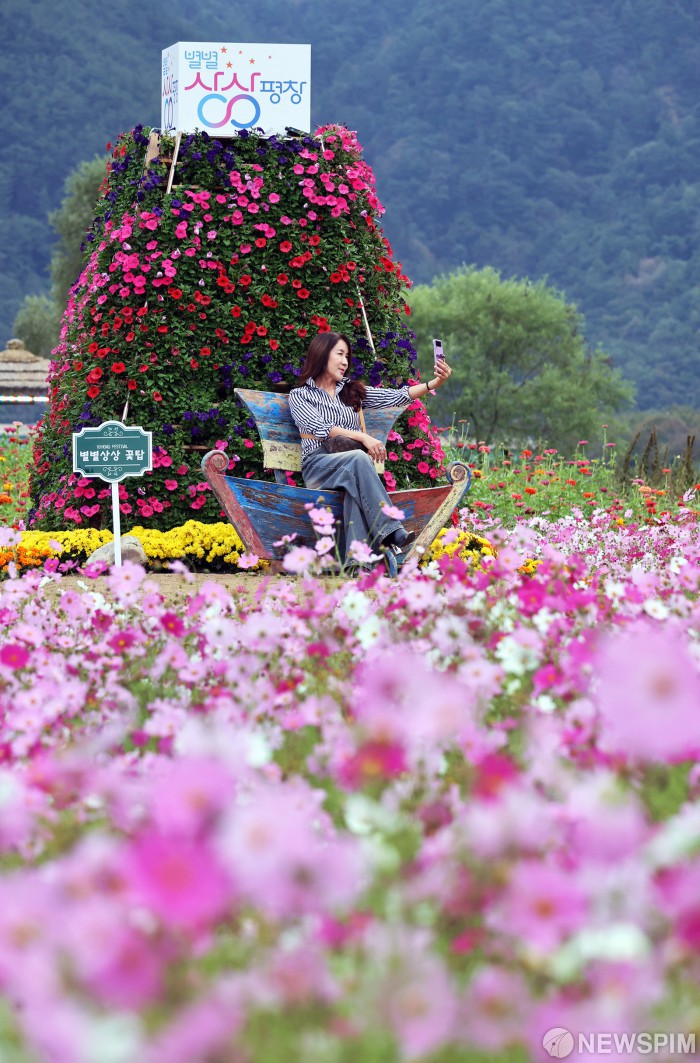 [서울=뉴스핌] 양윤모 기자 = 5일 오후 추석연휴를 맞아 평창읍 평창강 일원에서 열린 '2025 평창 백일홍축제'를 찾은 방문객들이 백일홍 꽃밭에서 연휴를 즐기고 있다. '가을향기, 백일홍으로 물들다'를 주제로 열리는 올 해 축제는 백일홍, 코스모스 등 다양한 볼거리 및 체험 프로그램으로 12일까지 펼쳐진다. [사진= 평창군청] 2025.10.05 yym58@newspim.com