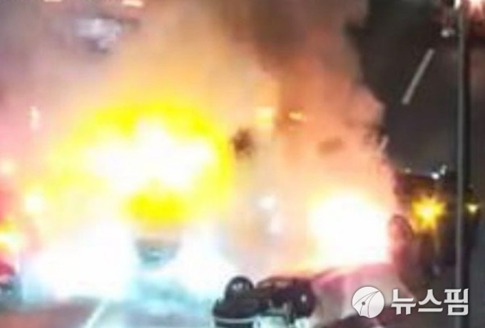 [용인=뉴스핌] 박승봉 기자 = 5일 밤 용인특례시 기흥구 경부고속도로 서울 방향 신갈분기점(JC) 인근에서 승용차 한 대가 전복돼 불이 났다.