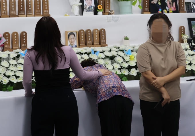 [무안=뉴스핌] 박진형 기자 = 전남 무안국제공항 합동분향소에서 추석 당일인 6일 오후 12·29 여객기 참사 희생자 추모행사가 진행되며 유가족들이 눈물을 흘리고 있다. 2025.10.06 bless4ya@newspim.com