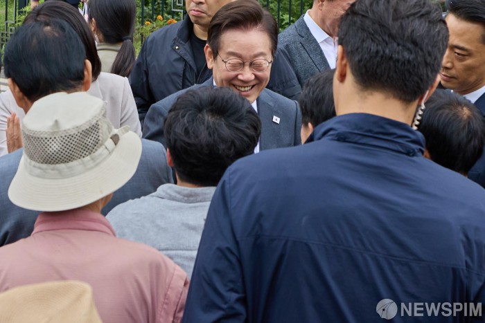 [서울=뉴스핌] 이재명 대통령이 6일 추석을 맞아 고향인 경북 안동에 위치한 부모님의 선영에 향하며 주민들과 인사를 나누고 있다. [사진=이재명 대통령 SNS] 2025.10.06 photo@newspim.com