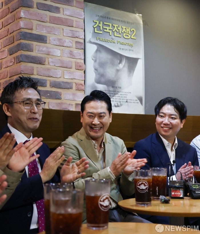 [서울=뉴스핌] 최지환 기자 = 장동혁 국민의힘 대표가 7일 오후 서울 영등포구 롯데시네마 영등포점에서 청년들과 '건국전쟁2'를 관람하기 앞서 '건국전쟁 1·2'를 제작한 김덕영 감독과 대화를 하고 있다. 2025.10.07 choipix16@newspim.com