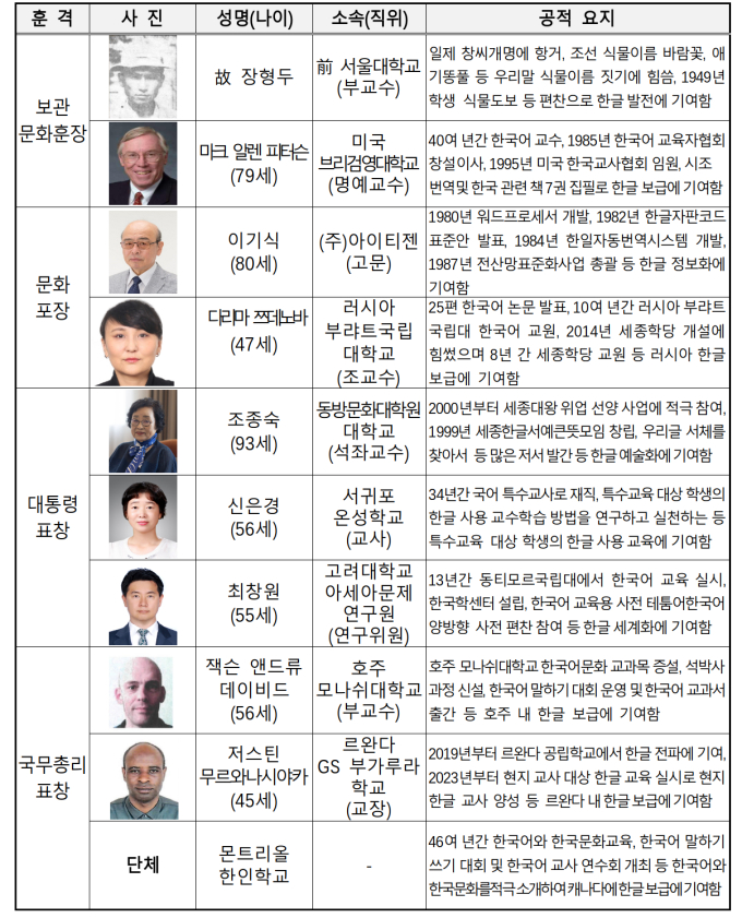 대통령 표창은 한글 서체 개발과 활발한 전시 활동으로 한글의 예술적 가치를 널리 알리고, 제자 양성으로 한글 예술을 전승하는 데 기여한 조종숙 동방문화대학원대학교 석좌교수, 특수교육 교사로서 특수교육 대상 학생을 위한 한글 교수법을 연구하고 이를 교육 현장에 적용, 한글 학습 기회를 넓힌 신은경 서귀포온성학교 교사, 동티모르에서 13년 이상 한국어 교수로서 한국어 학습용 사전 편찬 등 한국어 교육·확산의 기반을 다진 최창원 고려대학교 아세아문제연구원 연구위원에게 수여한다.