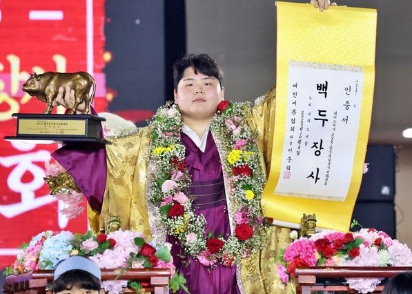 2025년 추석 백두장사 꽃가마를 탄 김민재. [사진=대한씨름협회]