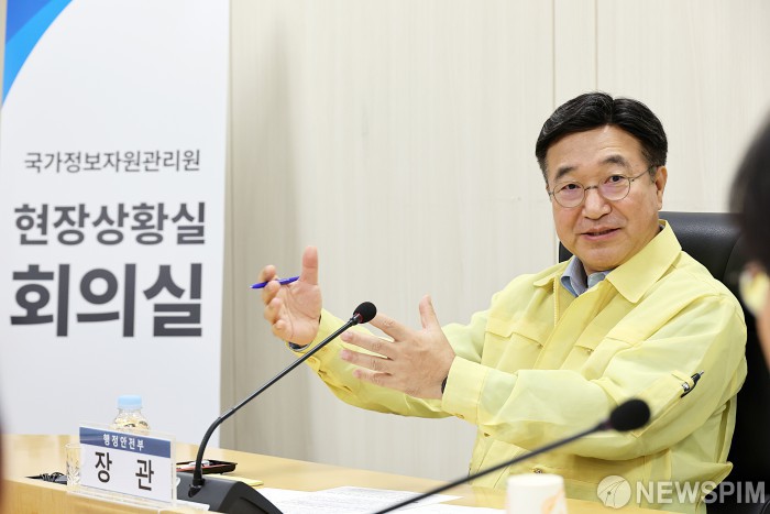 [서울=뉴스핌] 윤호중 행정안전부 장관이 8일 오후 국가정보자원관리원 대전센터를 방문하여 화재로 서비스가 중단된 행정정보시스템 복구현장을 점검한 뒤 복구계획 보고회를 하고 있다. [사진=행정안전부] 2025.10.08 photo@newspim.com