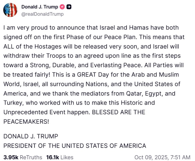 트럼프 대통령이 10월 8일(현지시간) 가자지구 1단계 합의 사실을 트루스소셜을 통해 공개했다. [사진=트루스소셜 트럼프계정] |