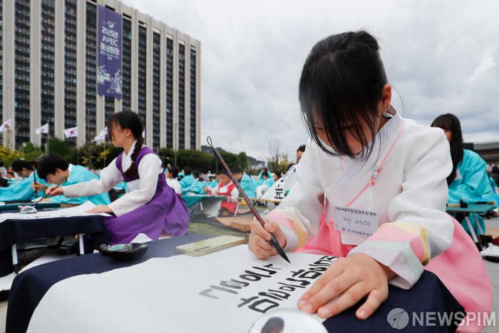 [서울=뉴스핌] 류기찬 기자 = 제579회 한글날인 9일 오전 서울 종로구 광화문광장에서 열린 ‘한글창제 579주년 기념 광화문광장 휘호대회’에서 참가자들이 경연을 펼치고 있다. 2025.10.09 ryuchan0925@newspim.com