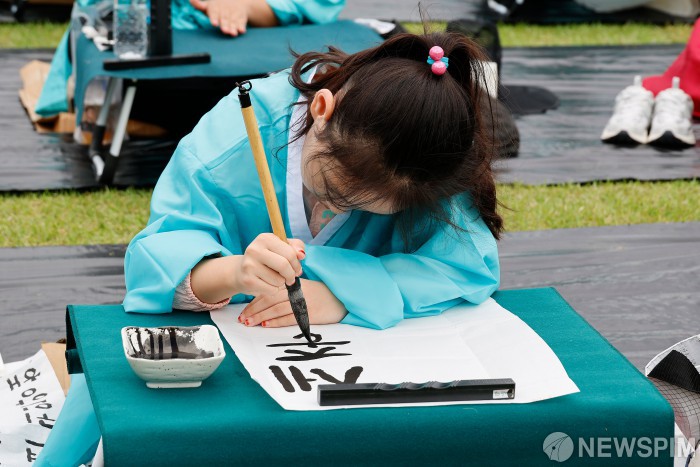 [서울=뉴스핌] 류기찬 기자 = 제579회 한글날인 9일 오전 서울 종로구 광화문광장에서 열린 ‘한글창제 579주년 기념 광화문광장 휘호대회’에서 참가자들이 경연을 펼치고 있다. 2025.10.09 ryuchan0925@newspim.com