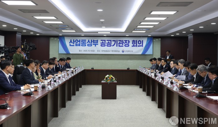 [서울=뉴스핌] 김정관 산업통상부 장관이 10일 서울 종로구 한국무역보험공사 대회의실에서 열린 산업통상부 소관 공공기관장 회의에서 모두발언을 하고 있다. [사진=산업통상부] 2025.10.10 photo@newspim.com