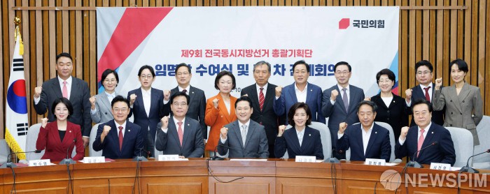 [서울=뉴스핌] 윤창빈 기자 = 장동혁 국민의힘 대표, 송언석 원내대표, 나경원 위원장 등 참석자들이 10일 오전 서울 여의도 국회에서 열린 지방선거총괄기획단 임명장 수여식 및 제1차 전체회의에서 기념촬영을 하고 있다. 2025.10.10 pangbin@newspim.com