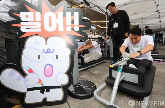[서울=뉴스핌] 김학선 기자 = 오세훈 서울시장이 10일 서울 동대문 DDP 어울림 광장에서 열린 더 건강한 서울 9988, 체력 회복 챌린지 행사에서 체력측정을 하고 있다. 2025.10.10 yooksa@newspim.com