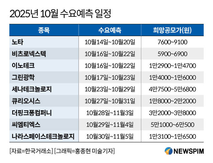 [서울=뉴스핌] 이나영 기자= 국내 기업공개(IPO) 시장이 하반기 활기를 되찾고 있다. 지난 8~9월에는 규제 강화와 투자심리 위축으로 사실상 멈춰 섰지만, 10월 들어 다양한 기업이 수요예측에 나서면서 성수기 흐름을 보이고 있다. 연말까지 기술특례 상장 바이오기업, 소비재, 콘텐츠, 위성 산업 등 다양한 업종이 상장을 준비 중이다.