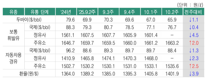 지난주(10월 1주) 정유사 휘발유 공급가격은 전주보다 4.5원 하락한 리터당 1601.4원, 경유 공급가격은 2.3원 하락한 리터당 1468.0원으로 집계됐다.