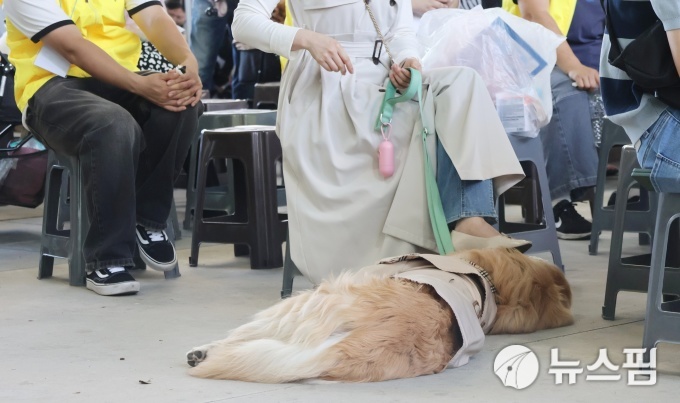 [광주=뉴스핌] 박진형 기자 = 11일 광주 서구 김대중컨벤션센터 야외광장에서 열린 '2025 광주 펫크닉'에서 반려견이 주인과 함께 놀다가 지쳤는지 휴식을 취하고 있다. 2025.10.11 bless4ya@newspim.com