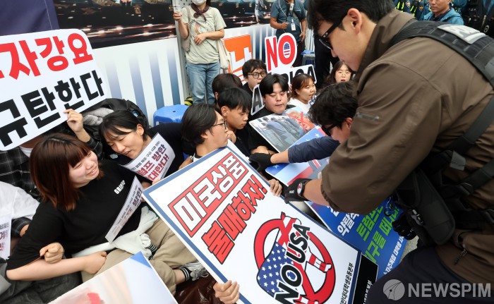 [서울=뉴스핌] 최지환 기자 = 한국대학생진보연합 등 진보 학생단체가 결성한 자주독립 대학생 시국 농성단이 11일 오후 서울 종로구 미국대사관 앞 광화문광장에서 트럼프 미 대통령을 규탄하는 미신고 집회를 진행하다 경찰에 강제해산을 당하고 있다. 2025.10.11 choipix16@newspim.com