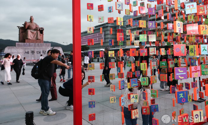 [서울=뉴스핌] 최지환 기자 = 11일 오후 서울 종로구 광화문광장에서 열린 한글문화산업전에서 시민들이 부스를 체험하고 있다. 2025.10.11 choipix16@newspim.com