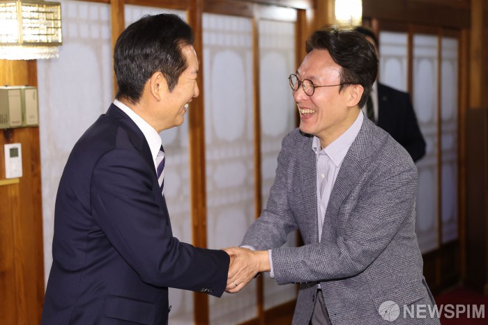 [서울=뉴스핌] 양윤모 기자 = 김민석 국무총리와 정청래 더불어민주당 대표가 12일 서울 종로구 삼청동 국무총리 서울공관에서 열린' 제4차 고위당정협'의회'에 앞서 인사를 나누고 있다. 2025.10.12 yym58@newspim.com