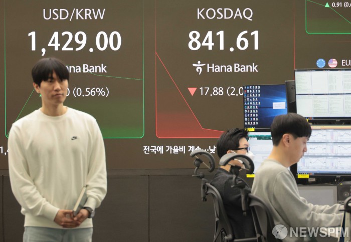 [서울=뉴스핌] 이길동 기자 = 13일 오전 서울 중구 하나은행 딜링룸에 코스피-코스닥 지수 및 달러/원 환율이 표시되어 있다. 이날 코스피는 전 거래일보다 60.52p(1.68%) 내린 3550.08에 코스닥 지수는 전 거래일보다 13.73p(1.60%) 내린 845.76에 거래를 시작했다. 서울 외환시장에서 달러/원 환율은 전장보다 9.0원 오른 1430.0원에 개장했다.2025.10.13 gdlee@newspim.com