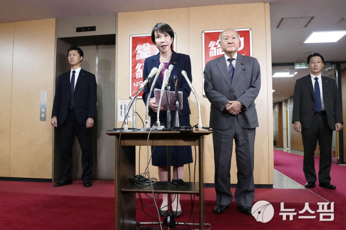 다카이치 사나에 일본 자민당 총재가 10일 공명당의 사이토 데쓰오 대표와 회담 후 기자회견을 하고 있다. [사진=로이터 뉴스핌]