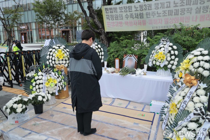 [서울=뉴스핌] 이길동 기자 = 13일 김건희 특별검사팀 사무실이 있는 서울 광화문 KT웨스트빌딩 앞 인도에 신자유연대와 국민의힘평당원협의회 등 보수단체들에 의해 마련된 김건희 여사 일가의 '양평 공흥지구 특혜 의혹'과 관련해 수사받다 숨진 채 발견된 경기 양평군 공무원 A씨의 분향소가 설치되어 있다.2025.10.13 gdlee@newspim.com