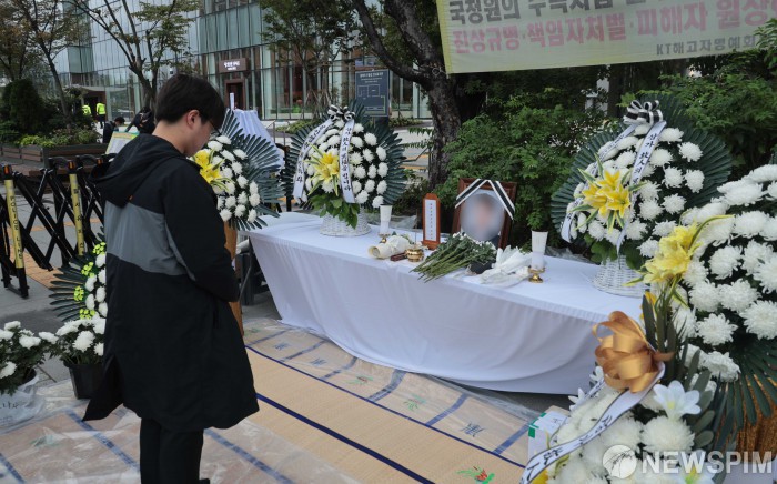 [서울=뉴스핌] 이길동 기자 = 13일 김건희 특별검사팀 사무실이 있는 서울 광화문 KT웨스트빌딩 앞 인도에 신자유연대와 국민의힘평당원협의회 등 보수단체들에 의해 마련된 김건희 여사 일가의 '양평 공흥지구 특혜 의혹'과 관련해 수사받다 숨진 채 발견된 경기 양평군 공무원 A씨의 분향소가 설치되어 있다.2025.10.13 gdlee@newspim.com