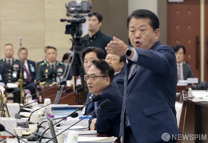 [서울=뉴스핌] 국회사진기자단 = 김병주 더불어민주당 의원이 13일 오전 서울 용산구 국방부 청사에서 열린 2025 국방부 국정감사에서 성일종 국회 국방위원장에게 항의하고 있다. 2025.10.13 photo@newspim.com
