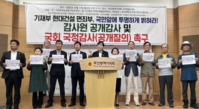 부산시민단체들은 13일 부산시의회 브리핑룸에서 기자회견을 열고 "기획재정부는 근거 없는 유권해석으로 현대건설에 사실상 면죄부를 주며, 국가계약의 질서를 뿌리째 흔드는 위험한 전례를 남겼다"고 주장했다.