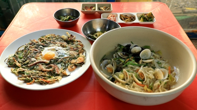 [서울=뉴스핌] 오광수 문화전문기자 = 장봉도에서 맛 볼 수 있는 파전과 칼국수. [사진 = EBS] 2025.10.13 oks34@newspim.com |