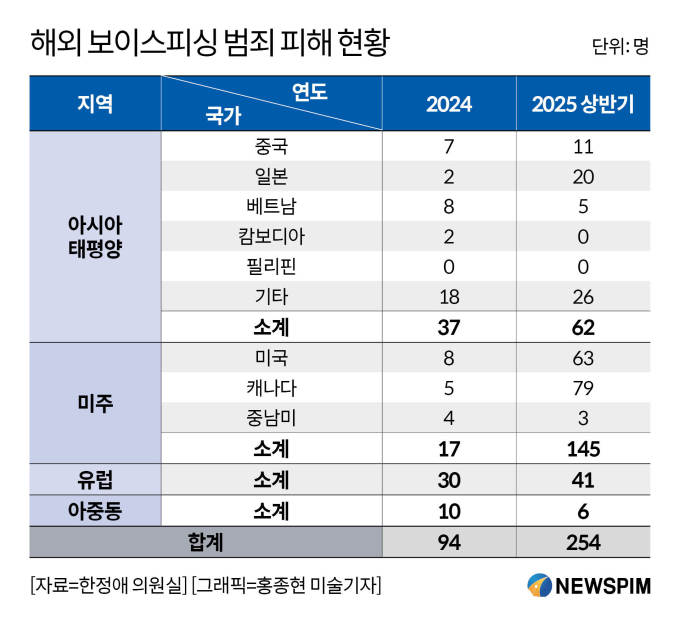 13일 국회 외교통일위원회 소속 한정애 더불어민주당 의원실이 외교부로부터 받은 자료를 보면 해외 보이스피싱 범죄 피해는 지난해 94건에서 올해 상반기 254건으로 3배 가까이 피해 건수가 늘었다.