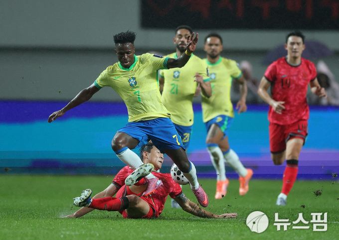 [서울 로이터=뉴스핌] 손지호 기자 = 한국 축구 대표팀 수비수 김민재(아래)가 10일 열린 브라질 대표팀과의 친선경기에서 비니시우스 주니오르를 태클로 저지하고 있다. 2025.10.13 thswlgh50@newspim.com |