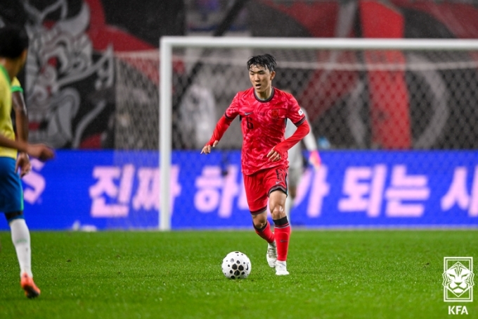 [서울=뉴스핌] 손지호 기자 = 황인범이 10일 열린 브라질 대표팀과의 친선경기에서 상대 진영으로 전진하고 있다. [사진=대한축구협회] 2025.10.13 thswlgh50@newspim.com |