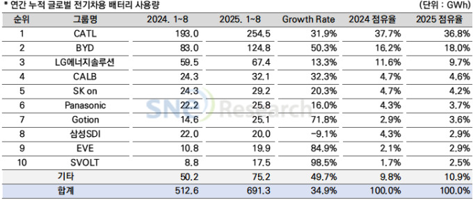 중국 CATL은 254.5GWh로 31.9% 성장하며 1위를 지켰다. 지크(ZEEKR), 아이토(AITO), 리오토, 샤오미를 비롯해 테슬라, BMW, 메르세데스-벤츠, 폭스바겐 등 주요 완성차 업체가 CATL 배터리를 사용하고 있다.