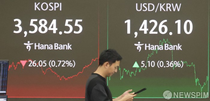 [서울=뉴스핌] 양윤모 기자 = 미·중 간 무역 갈등이 재점화된 가운데 13일 오후 코스피가 전장 종가보다 26.05 포인트(0.72%) 하락하며 3584.55로, 코스닥은 1.00 포인트(0.12%) 상승한 860.49로 장을 마감한 가운데, 서울 중구 하나은행 딜링룸에서 직원들이 업무를 보고 있다. 서울외환시장에서 달러/원 환율은 전장 대비 5.10원 상승한 1426.10원에 거래를 마감했다. 2025.10.13 yym58@newspim.com