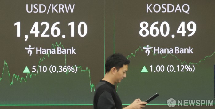 [서울=뉴스핌] 양윤모 기자 = 미·중 간 무역 갈등이 재점화된 가운데 13일 오후 코스피가 전장 종가보다 26.05 포인트(0.72%) 하락하며 3584.55로, 코스닥은 1.00 포인트(0.12%) 상승한 860.49로 장을 마감한 가운데, 서울 중구 하나은행 딜링룸에서 직원들이 업무를 보고 있다. 서울외환시장에서 달러/원 환율은 전장 대비 5.10원 상승한 1426.10원에 거래를 마감했다. 2025.10.13 yym58@newspim.com