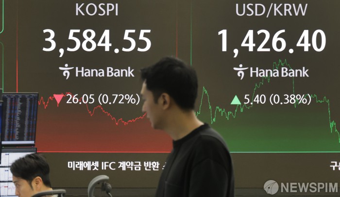 [서울=뉴스핌] 양윤모 기자 = 미·중 간 무역 갈등이 재점화된 가운데 13일 오후 코스피가 전장 종가보다 26.05 포인트(0.72%) 하락하며 3584.55로, 코스닥은 1.00 포인트(0.12%) 상승한 860.49로 장을 마감한 가운데, 서울 중구 하나은행 딜링룸에서 직원들이 업무를 보고 있다. 서울외환시장에서 달러/원 환율은 전장 대비 5.40원 상승한 1426.40원에 거래를 마감했다. 2025.10.13 yym58@newspim.com