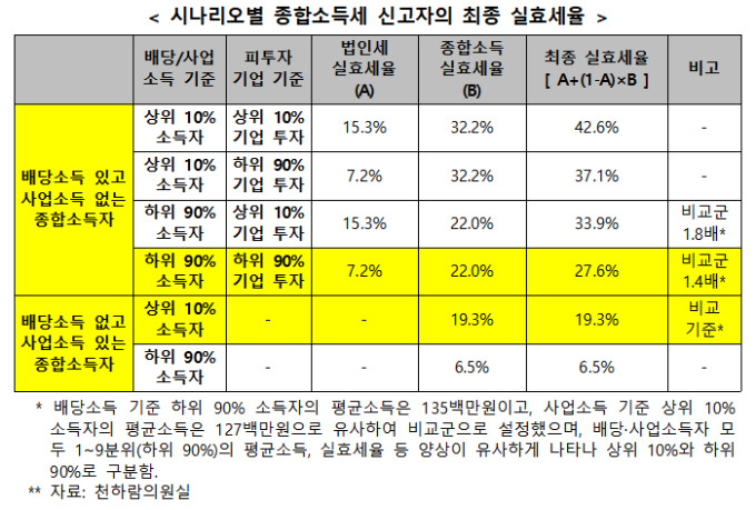국세청이 제출한 자료에 따르면, 배당소득이 없고 사업소득은 있는 종합소득세 신고자의 종합소득금액 대비 총결정세액(실효세율)은 11.6%였고, 같은 방법으로 사업소득이 없고 배당소득이 있는 종합소득자의 실효세율은 26.7%였다.