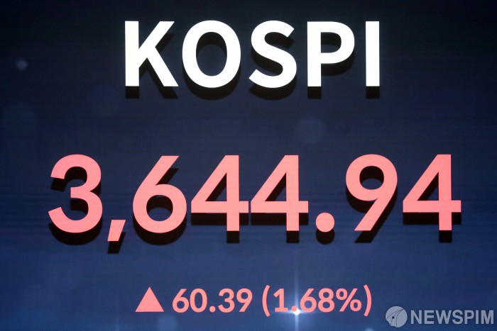 [서울=뉴스핌] 이형석 기자 = 14일 코스피 지수가 장중 1%대 이상 상승하며 사상 최고치를 경신했다. 서울 여의도 한국거래소 전광판에 코스피 지수가 전 거래일보다 60.39p(1.68%) 오른 3644.94가 표시되고 있다. 2025.10.14 leehs@newspim.com