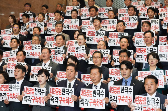 [서울=뉴스핌] 윤창빈 기자 = 정청래 더불어민주당 대표, 김병기 원내대표 등 소속 의원들이 14일 오전 서울 여의도 국회 본청 로텐더홀 계단에서 열린 한덕수 등 국무위원 내란공모 규탄 기자회견에서 피켓을 들고 구호를 외치고 있다. 2025.10.14 pangbin@newspim.com