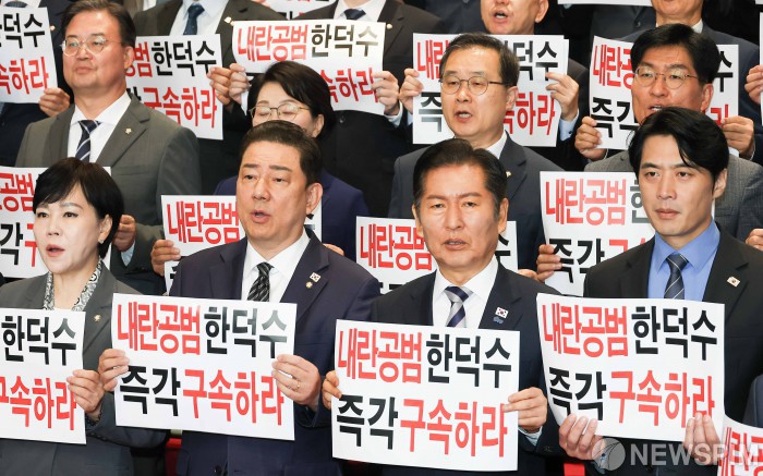 [서울=뉴스핌] 윤창빈 기자 = 정청래 더불어민주당 대표, 김병기 원내대표 등 소속 의원들이 14일 오전 서울 여의도 국회 본청 로텐더홀 계단에서 열린 한덕수 등 국무위원 내란공모 규탄 기자회견에서 피켓을 들고 구호를 외치고 있다. 2025.10.14 pangbin@newspim.com