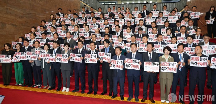 [서울=뉴스핌] 윤창빈 기자 = 정청래 더불어민주당 대표, 김병기 원내대표 등 소속 의원들이 14일 오전 서울 여의도 국회 본청 로텐더홀 계단에서 열린 한덕수 등 국무위원 내란공모 규탄 기자회견에서 피켓을 들고 구호를 외치고 있다. 2025.10.14 pangbin@newspim.com