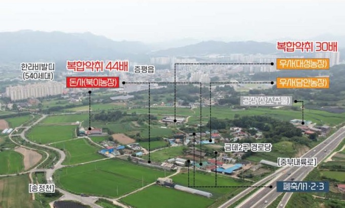 금대2리 일원에는 돼지 축사 1개소와 소 축사 2개소, 폐축사를 포함한 총 2만3368㎡ 규모의 시설이 철거된다.