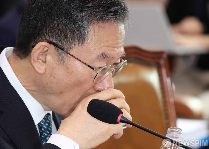 [서울=뉴스핌] 윤창빈 기자 = 정성호 법무부 장관이 14일 오전 서울 여의도 국회에서 열린 법제사법위원회의 법무부 등에 대한 국정감사에서 물을 마시고 있다. 2025.10.14 pangbin@newspim.com