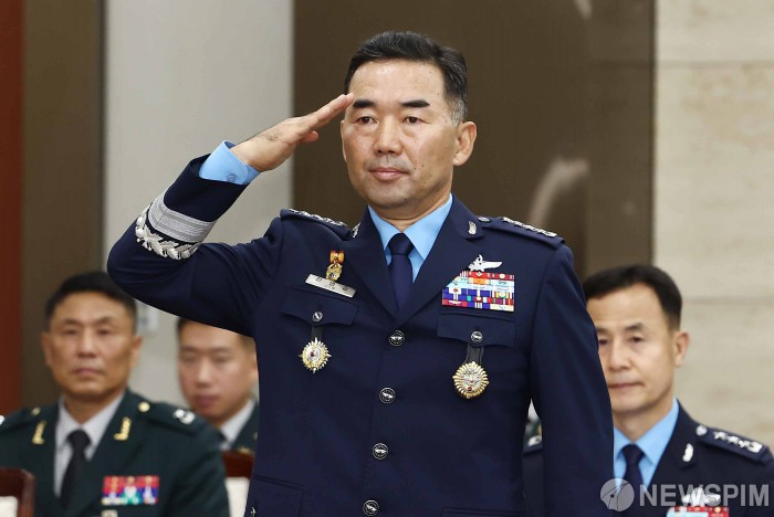 [서울=뉴스핌] 국회사진기자단 = 진영승 합동참모본부 의장이 14일 오전 서울 용산구 합동참모본부에서 열린 2025년 국정감사에서 증인 선서에 앞서 거수 경례를 하고 있다. 2025.10.14 photo@newspim.com
