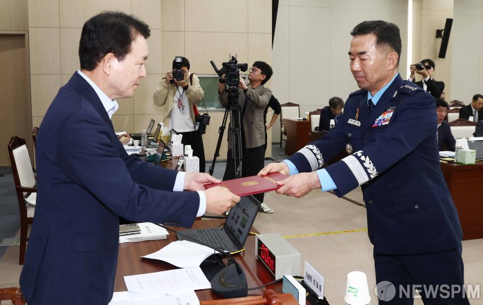 [서울=뉴스핌] 국회사진기자단 = 진영승 합동참모본부 의장이 14일 오전 서울 용산구 합동참모본부에서 열린 2025년 국정감사에서 성일종 국방위원장에게 증인 선서문을 제출하고 있다. 2025.10.14 photo@newspim.com