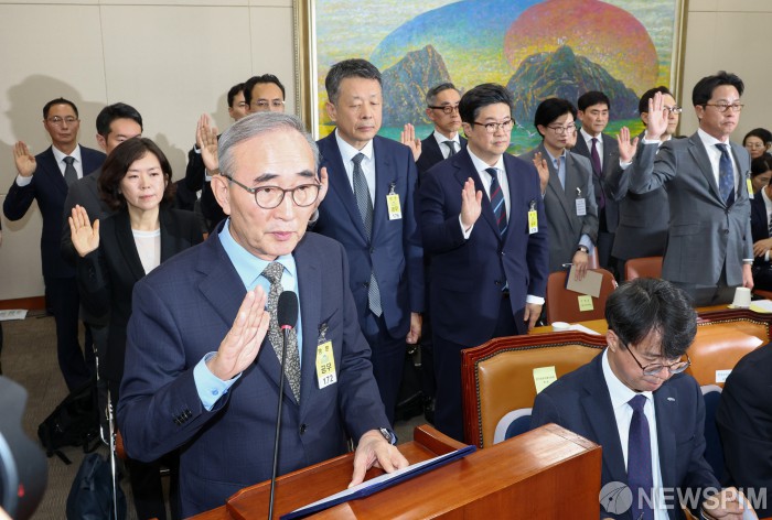 [서울=뉴스핌] 최지환 기자 = 김영섭 KT 대표가 14일 오후 서울 여의도 국회 정무위원회에서 열린 공정거래위원회, 개인정보보호위원회 등 국정감사에서 증인들과 증인선서를 하고 있다. 2025.10.14 choipix16@newspim.com