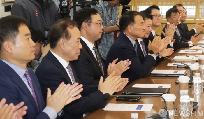 [서울=뉴스핌] 양윤모 기자 = 14일 오후 서울 서대문구 한국공인회계사 회관에서 개최된 '금융감독원장-회계법인 최고경영자(CEO) 간담회'에 참석자들이 박수를 치고 있다. 이자리에는 이찬진 금융감독원장,최운열 한국공인회계사회 회장,윤훈수 삼일회계법인 대표이사,김교태 삼정회계법인 대표이사,박용근 한영회계법인 대표,홍종성 안진회계법인 대표 등 12개 회계법인 대표들이 참석했다. 2025.10.14 yym58@newspim.com